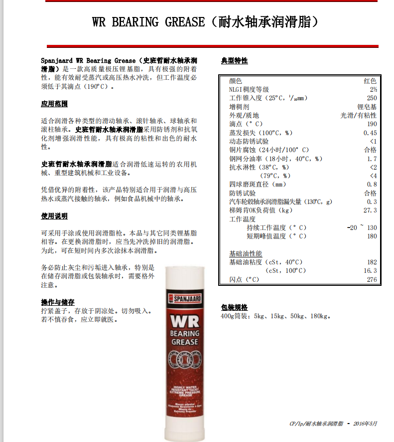 南非史班哲耐水軸承潤滑脂 WR BEARING GREASE耐高壓熱水潤滑脂
